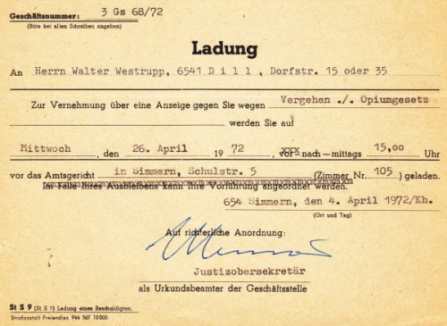 ![]() Dieses unser wirklich gutgemeintes Flugblatt bringt uns prompt die Anzeige eines Pastors ein: er will es als Aufruf zum Drogenkonsum verstanden haben. Seine Klage wird schließlich abgeschmettert (das dauert aber noch recht lange - da leben wir schon in Dill und die ganze Angelegenheit wird beim königlich-hunsrückschen Amtsgericht zu Simmern verhandelt – und die wussten überhaupt nicht, um was es wirklich ging) |