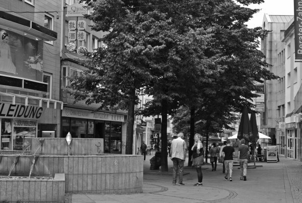 In die City fährt, wer dort arbeiten oder städtische Ämter besuchen oder eine größere Anschaffung in einem der Warenhäuser tätigen muß. Sonstige Anlaufpunkte sind abends ausschließlich Eventlocations wie angesagte Tanzpaläste (San Francisco, First Saloon, Top Ten für Teens und Twens) und die großen Lichtspielhäuser (mit der Lichtburg als größtem Kino Deutschlands vorneweg) - und die städtischen Kulturbetriebe wie Oper und Schauspiel: subventionierte Bühnen für die Eliten. (Ich werde nie den widerwilligen Gesichtsausdruck samt hochgezogenen Mundwinkeln und die abgespreizten Finger der Garderobenfrau im Grillo Theater vergessen, als ich bei meinem einzigen Theaterbesuch anlässlich Hochhuths Stellvertreter-Vorstellung meinen abgewetzten Parka dort abgab: dass sie mich nicht angekotzt hat, wundert mich heute noch...). Auch mit Jahrmärkten und Groß-Kirmes wird verzweifelt versucht, Menschen in die Stadt zu locken - klappt aber auch nicht so richtig. | |